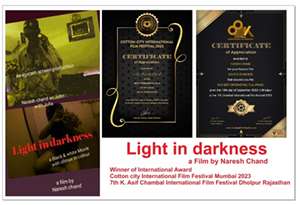 The Hindi feature film Light in Darkness, which is going to be released very soon, is a black and white feature film whose climax is in color. Apart from Hindi, there are some dialogues in English also. The film is directed, written and produced by Naresh Chand.