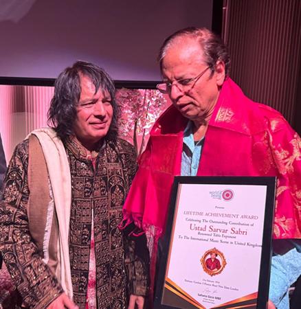 The Lifetime Achievement Award was presented to renowned tabla exponent Ustad Sarvar Sabri (UK) in recognition of his outstanding contribution to the International Music Scene in the United Kingdom. The son of the legendary sarangi maestro Ustad Sabri Khan, Ustad Sarvar Sabri has upheld a rich musical heritage while forging his own distinguished path as a master percussionist, composer, and educator.